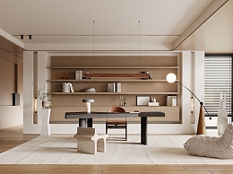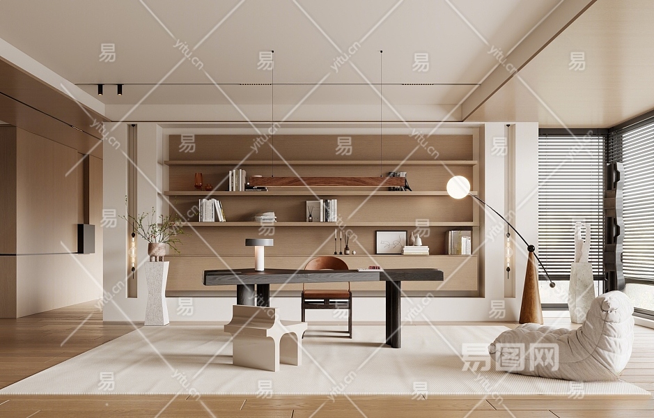现代书房 书柜 懒人沙发 书桌椅 落地灯