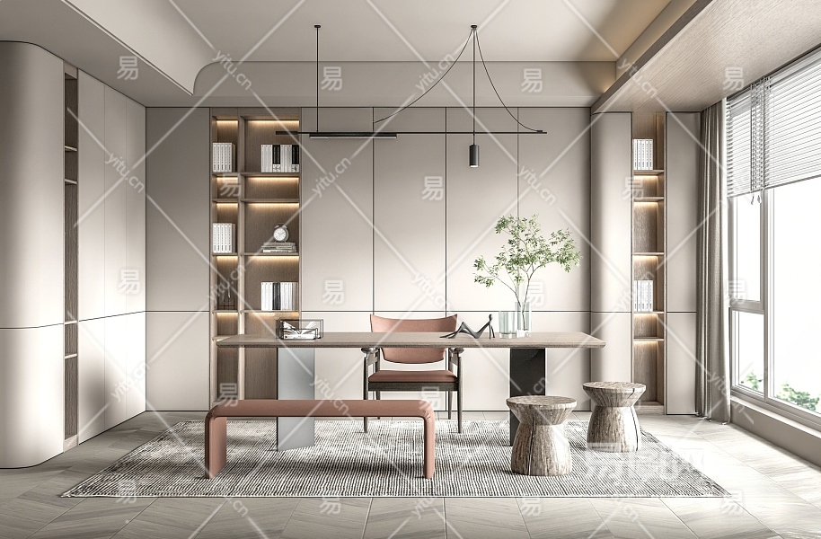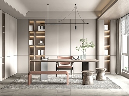现代书房 书桌椅 吊灯 书柜 矮凳