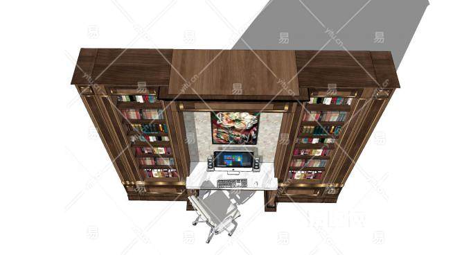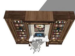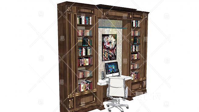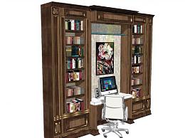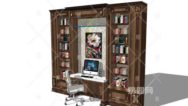欧式豪华书柜电脑桌组合SU模型下载_sketchup草图大师SKP模型