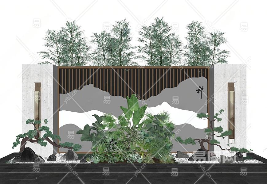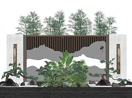 新中式景观小品 庭院花园 植物堆 绿植堆 盆景 背景墙