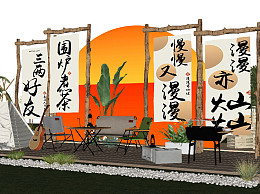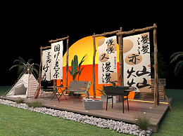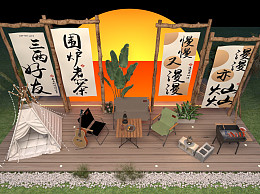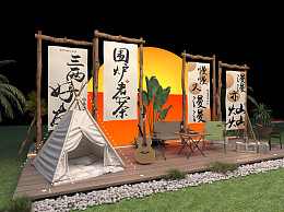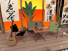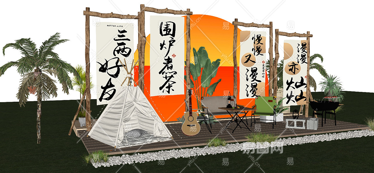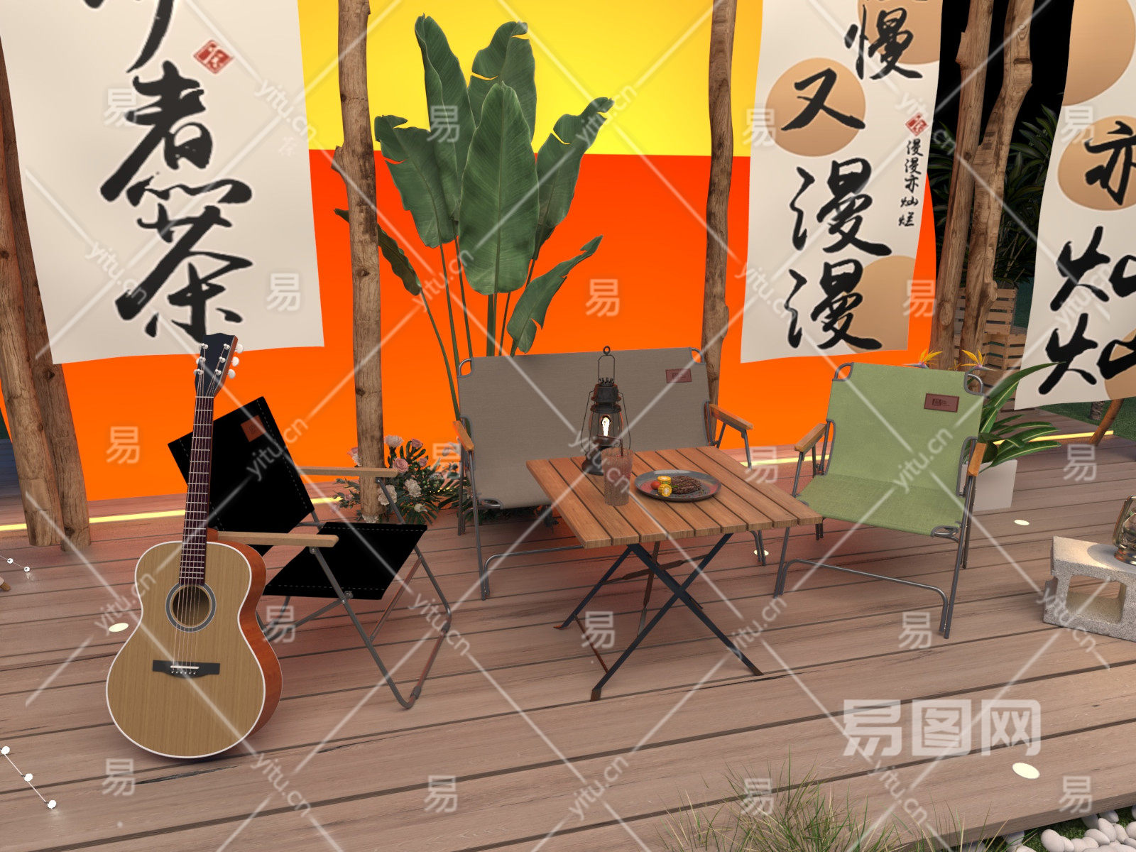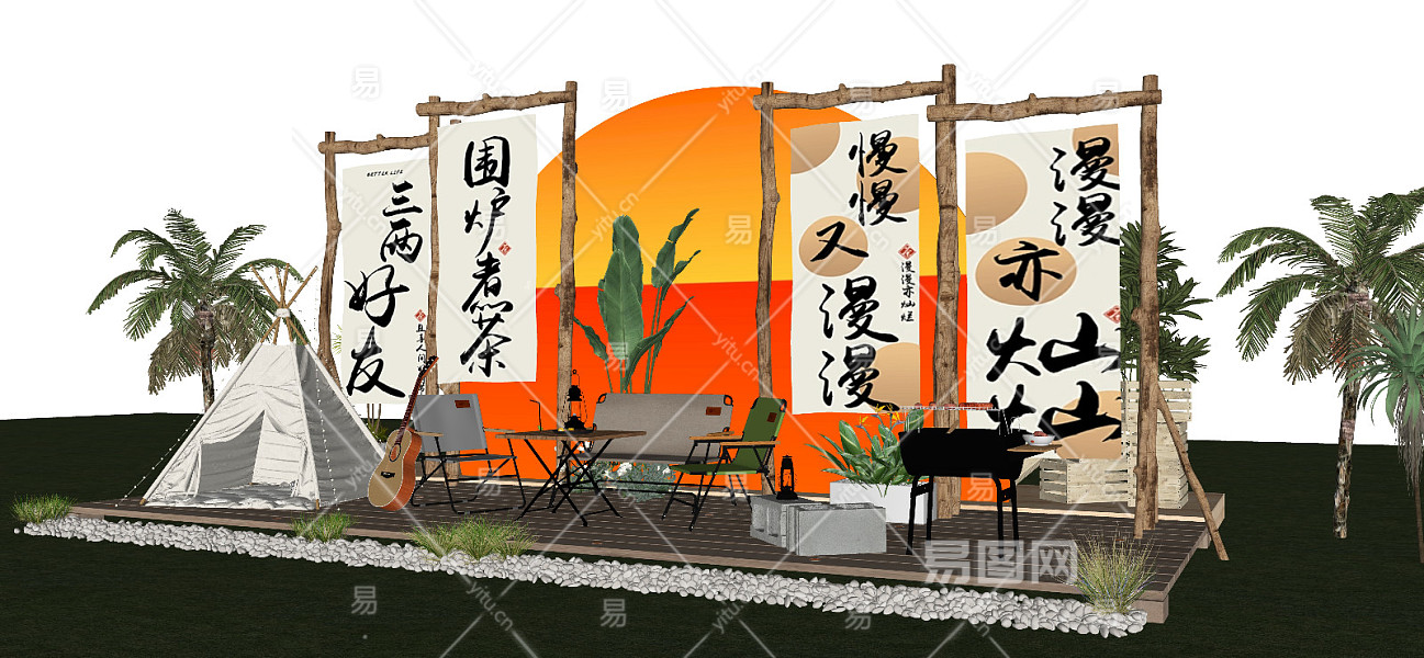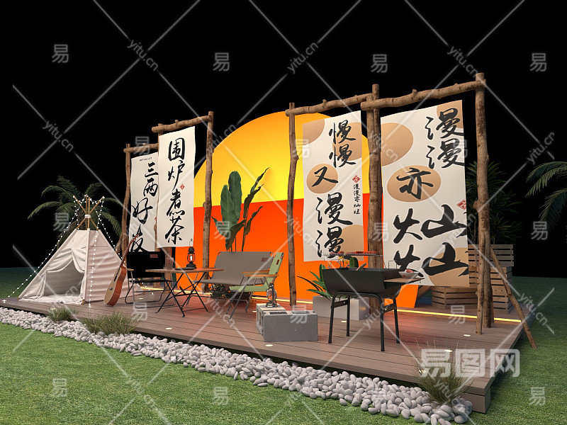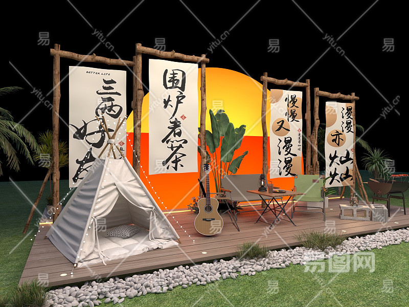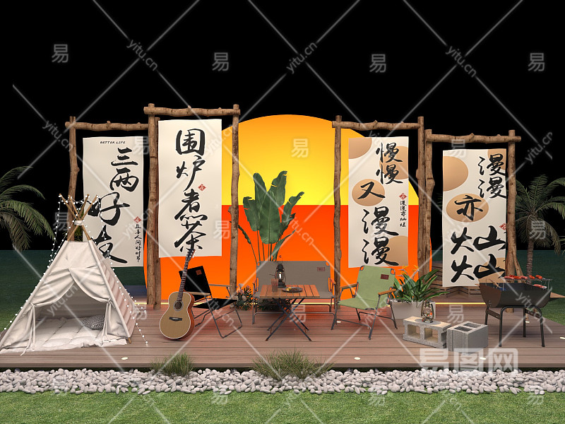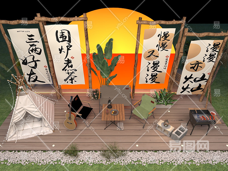 现代露营氛围场景 露营装备烤炉 落日帐篷挂帘 太阳背景樯美陈 绿植吉他草地