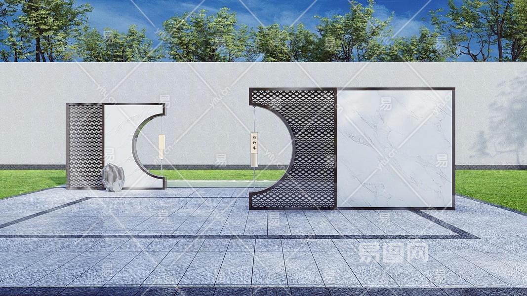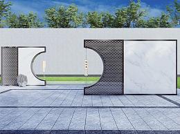 新中式景墙围墙 假山 片石 山纹 水景 雕塑 月洞门 格栅
