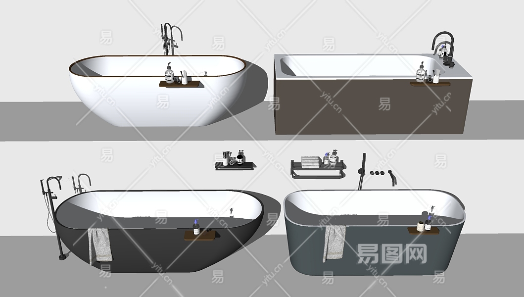 洁具用品 浴缸 开放外露独立浴缸龙头简约智能淋浴花洒壁挂毛巾架 su草图模型下载