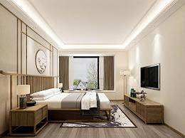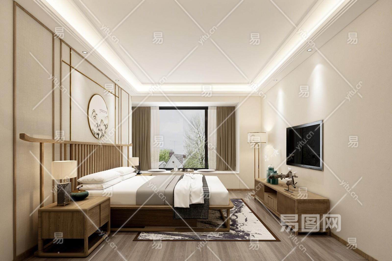 新中式卧室 床具 双人床 背景墙 吊灯 电视柜