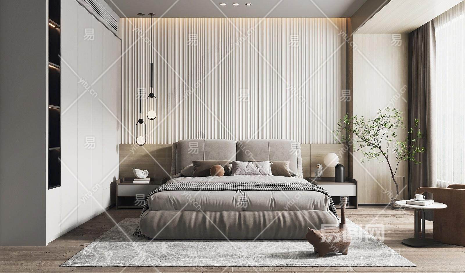现代卧室 次卧 客卧 床 床头柜 衣柜 摆件 窗帘 地毯 玩偶