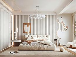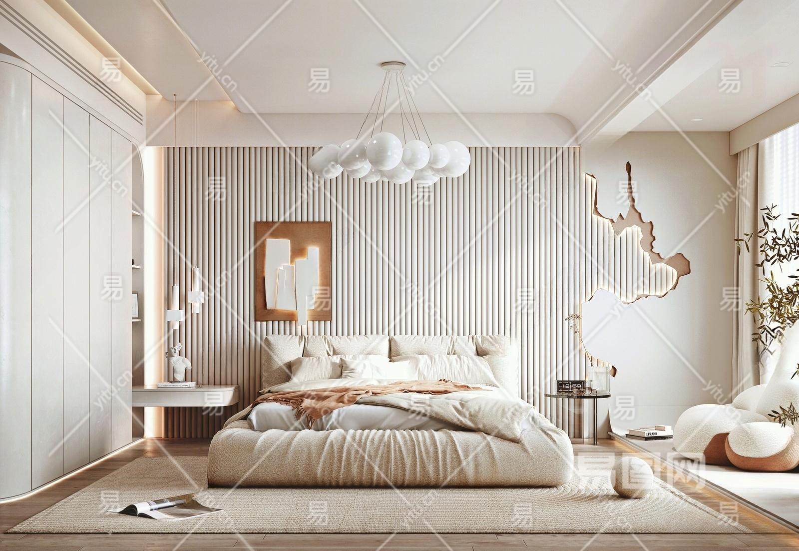 侘寂风格卧室 布艺双人床 衣柜 床头柜 边几 休闲沙发 绿植 吊灯 饰品