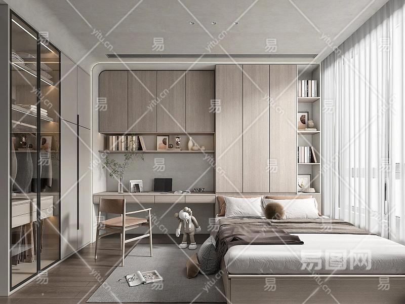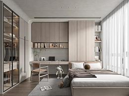 侘寂风榻榻米卧室 衣柜 书桌椅 雕塑装置 窗帘
