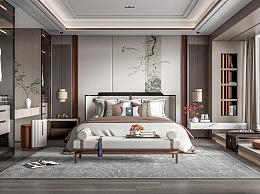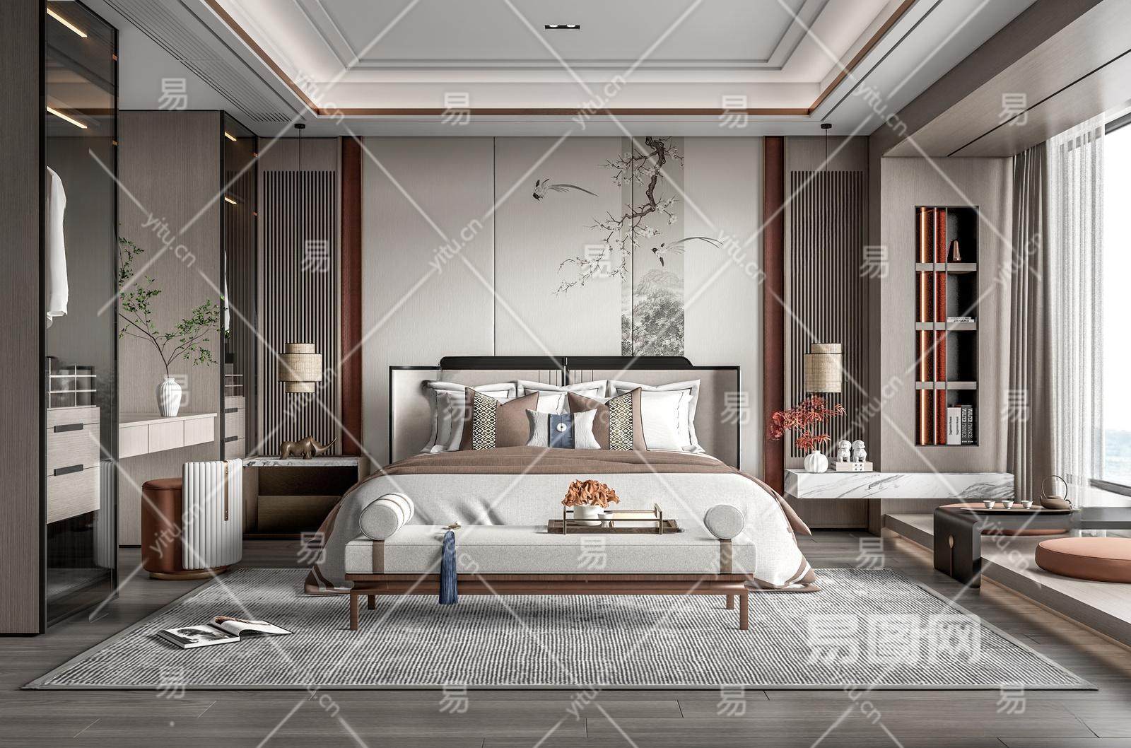 新中式卧室 双人床 床头柜 吊灯 衣柜 梳妆台 床尾凳 茶台