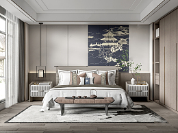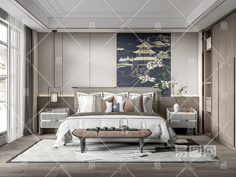 新中式卧室 双人床 床头柜 床尾凳 吊灯 衣柜 窗帘