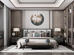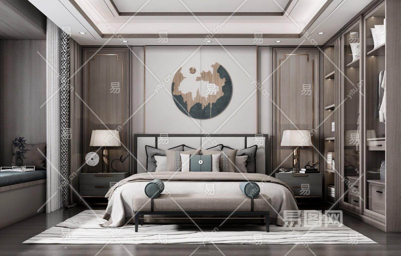 新中式卧室 双人床 床头柜组合 衣柜 床尾凳 墙饰 台灯 摆件