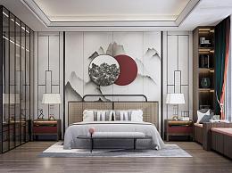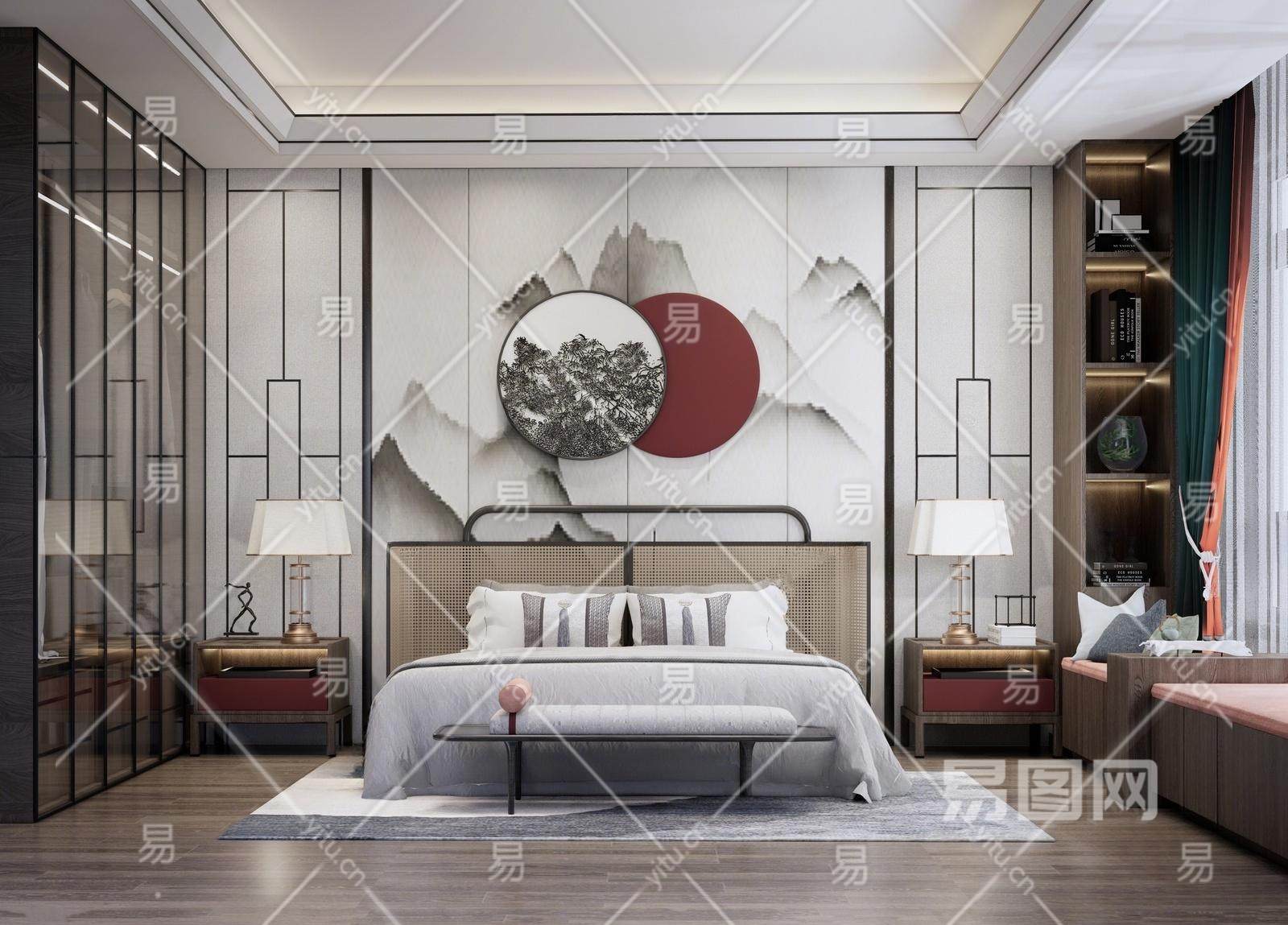 新中式风格家居卧室 双人床 床头柜 台灯 衣柜 窗帘 墙饰 雕塑摆件 床尾凳