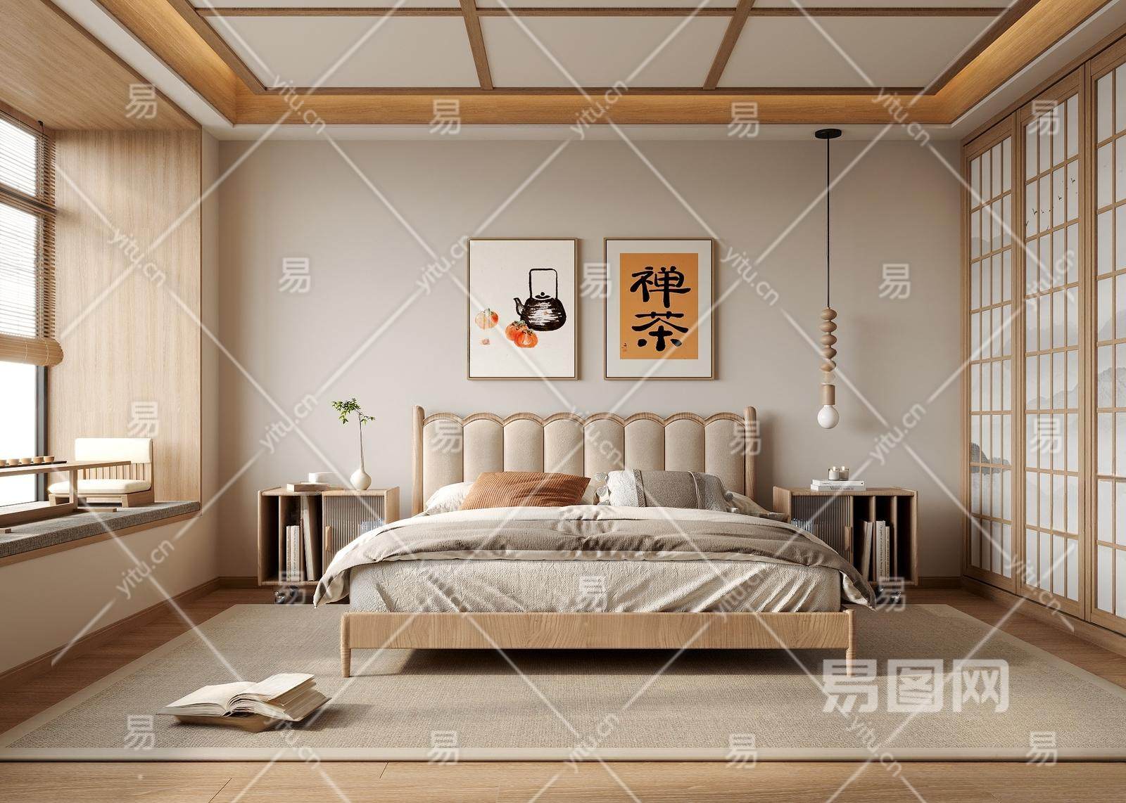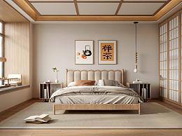 日式卧室 双人床 主卧室 床头柜 边几角几 装饰画 挂画 床头吊灯
