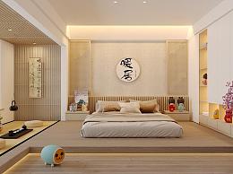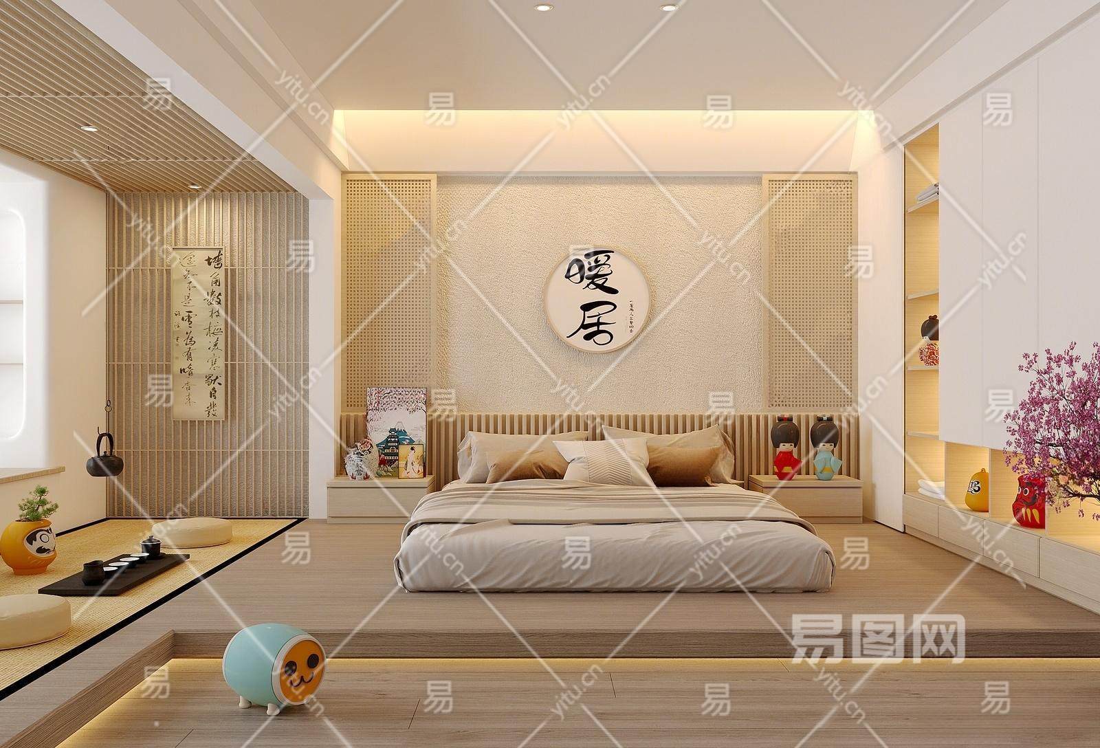 日式奶油风卧室 双人布艺床 茶台 衣柜床品 日式装饰摆件 圆坐垫
