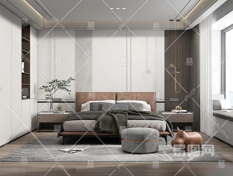 现代卧室 双人床 床头柜 吊灯 衣柜 窗帘 沙发凳