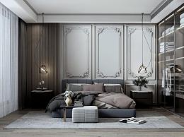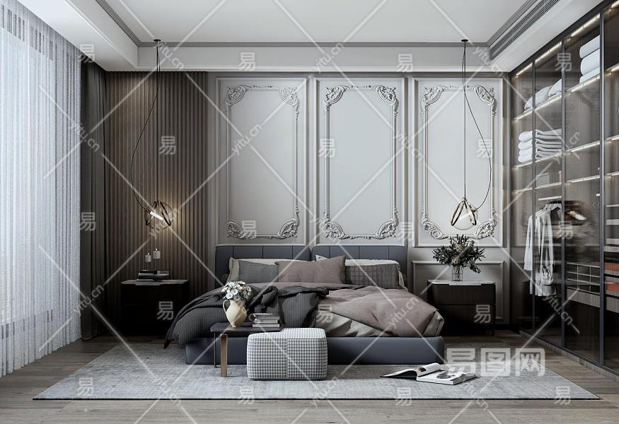 现代卧室 双人床 床头柜 衣柜 吊灯 墙饰 床尾凳 摆件