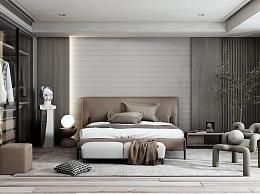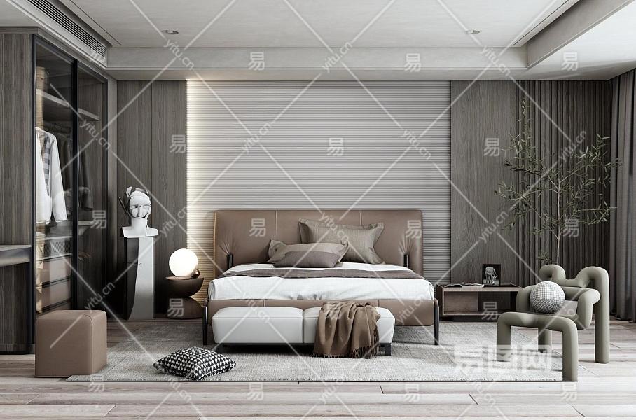现代卧室 双人床 床头柜组合 单人沙发 衣柜 绿植 摆件