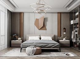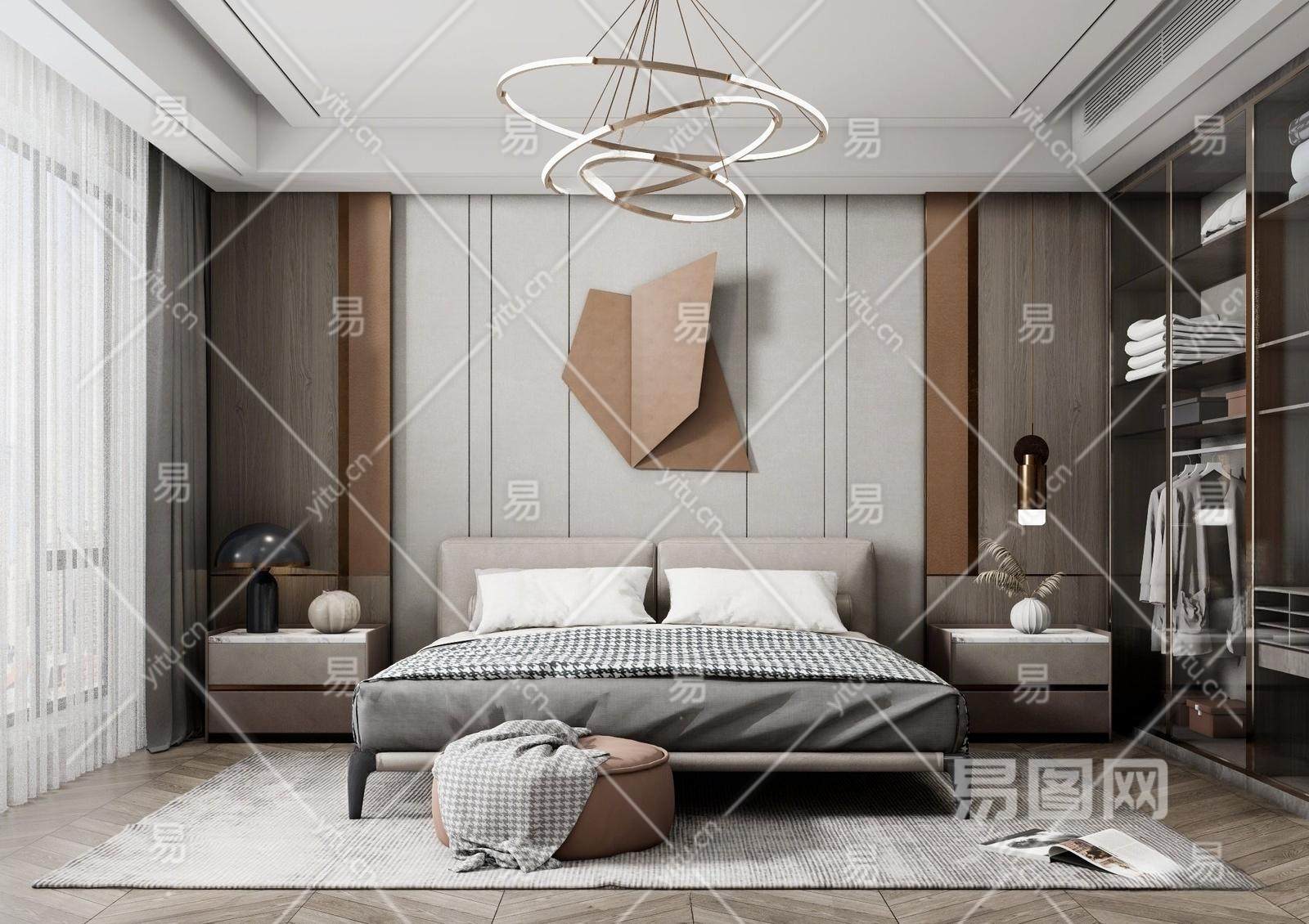现代卧室 双人床 床头柜组合 墙饰 吊灯 摆件 衣柜