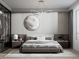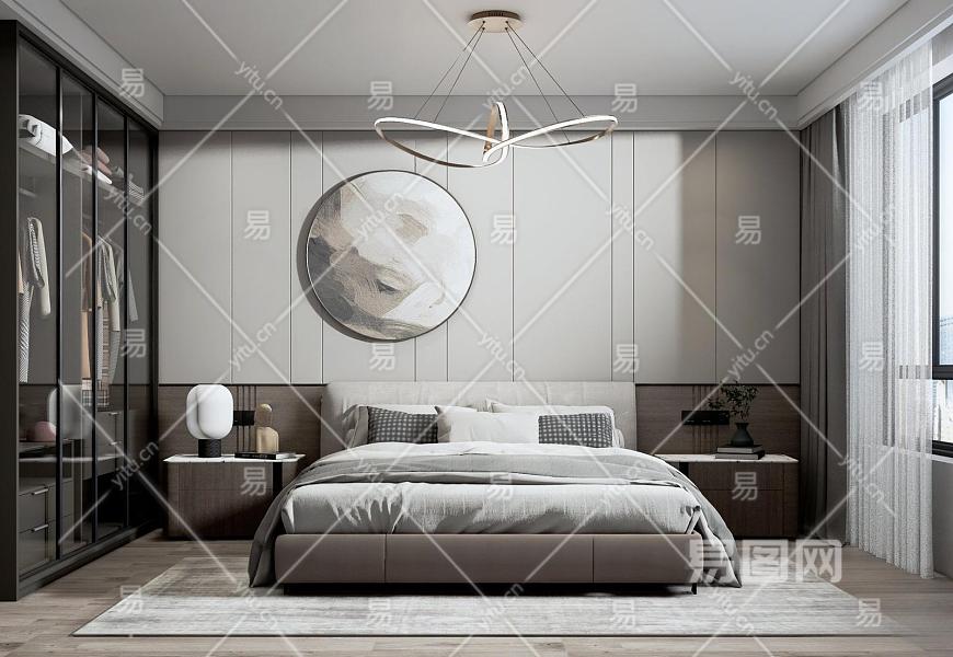 现代卧室 双人床 床头柜组合 墙饰 吊灯 衣柜 摆件