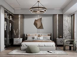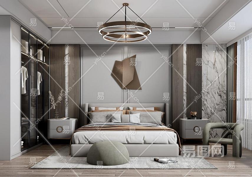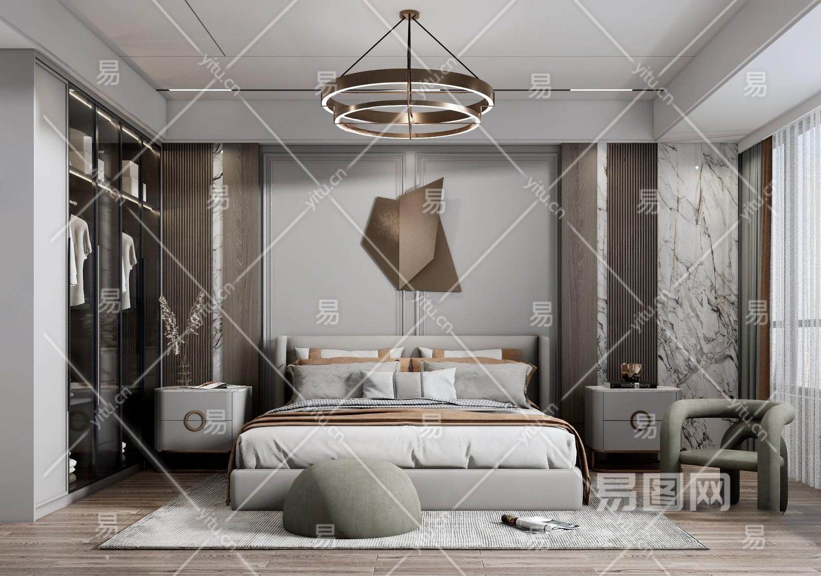 现代卧室 双人床 床头柜组合 墙饰 衣柜 吊灯 摆件