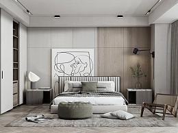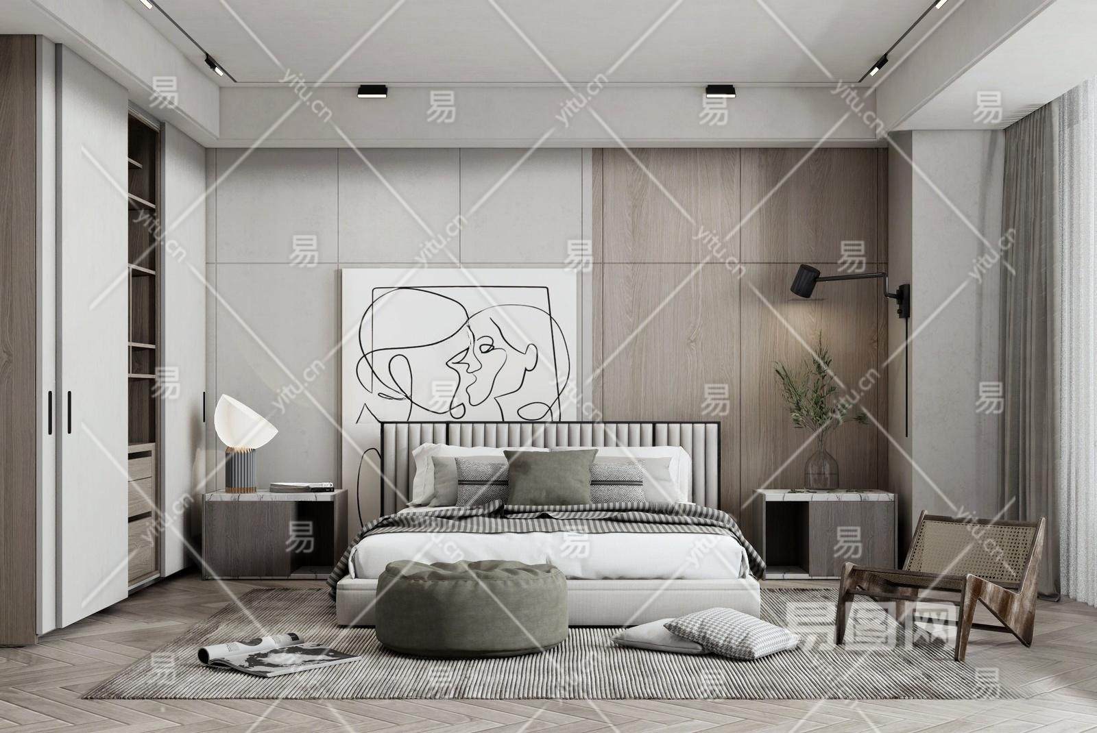 现代卧室 双人床 床头柜组合 床尾凳 衣柜 墙饰 摆件 装饰画