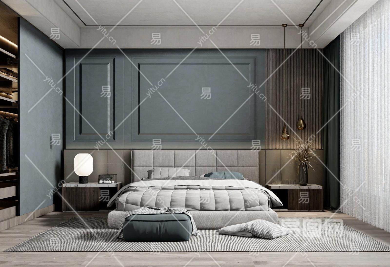 现代卧室 双人床 床头柜组合 床尾凳 衣柜 摆件