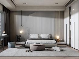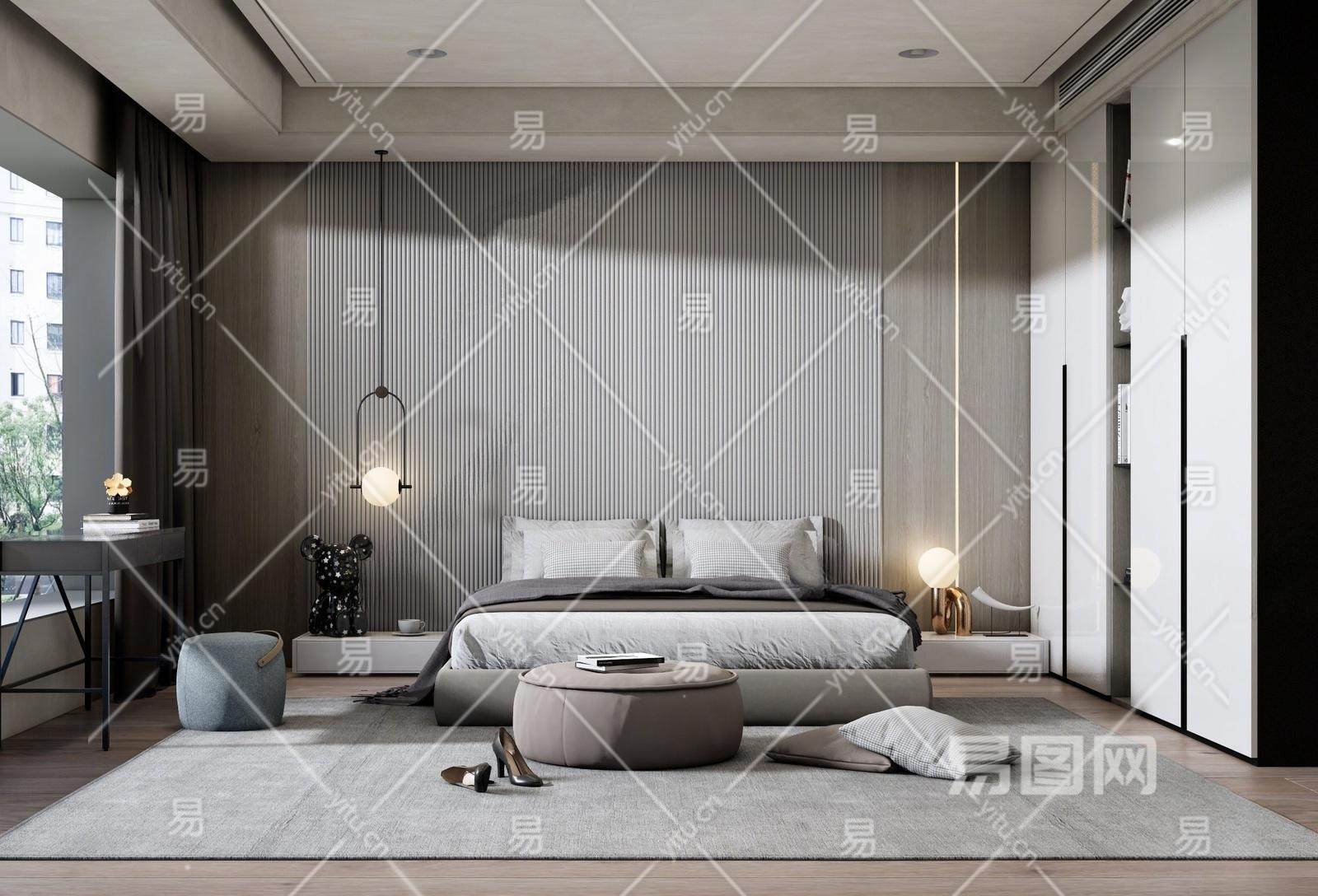 现代卧室 双人床 床头柜组合 床尾凳 衣柜 梳妆台