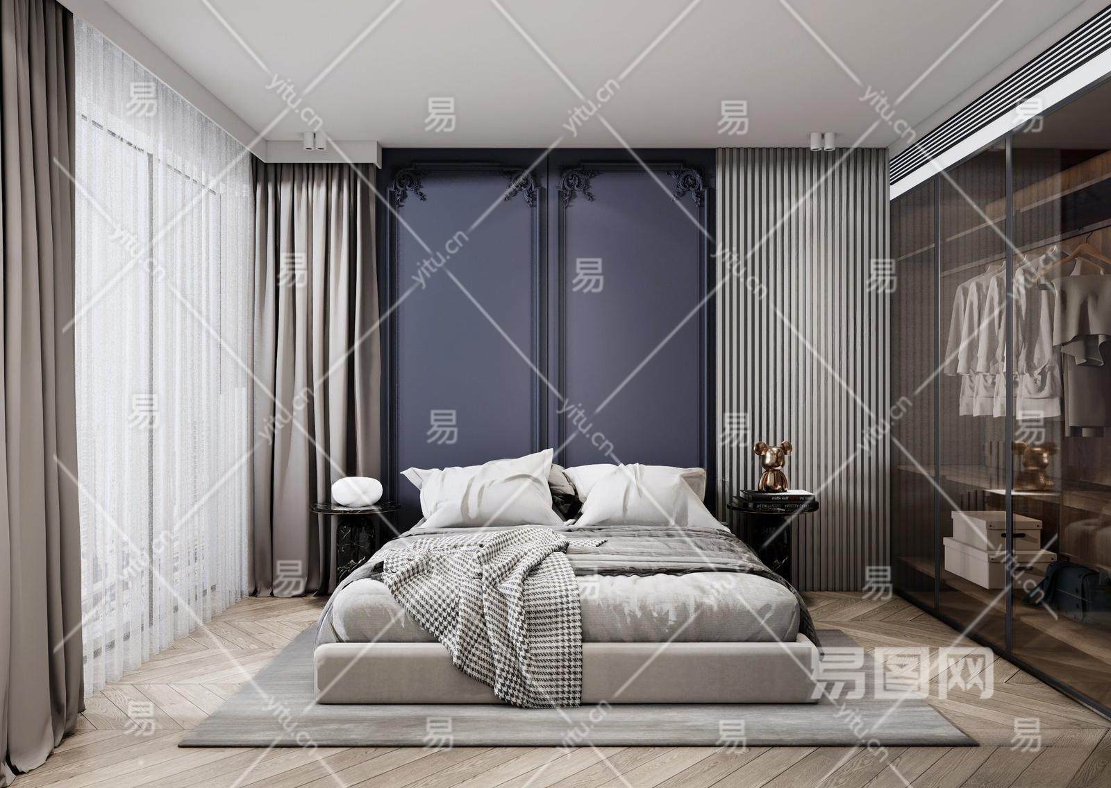 现代卧室 双人床 床头柜组合 衣柜 摆件