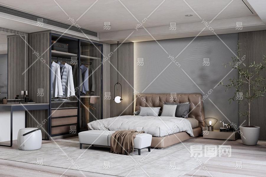 现代卧室 双人床 床头柜组合 衣柜 梳妆台 绿植 床尾凳 摆件