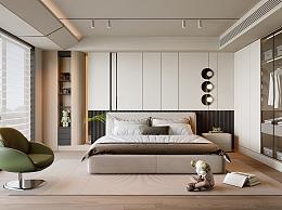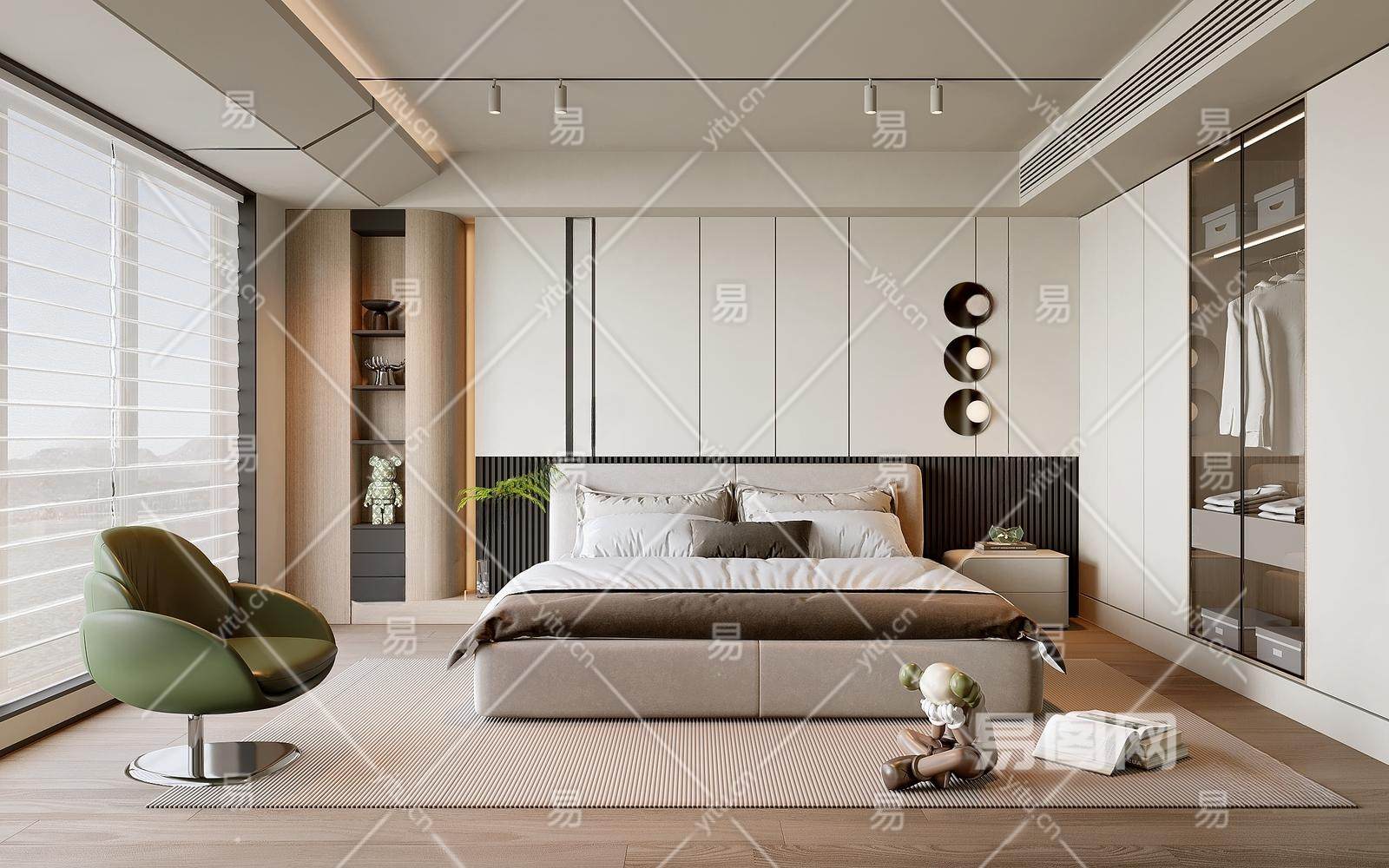 现代奶油风卧室 双人床 床头背景 休闲沙发 摆件 床头柜 衣柜 收纳柜