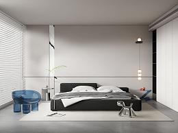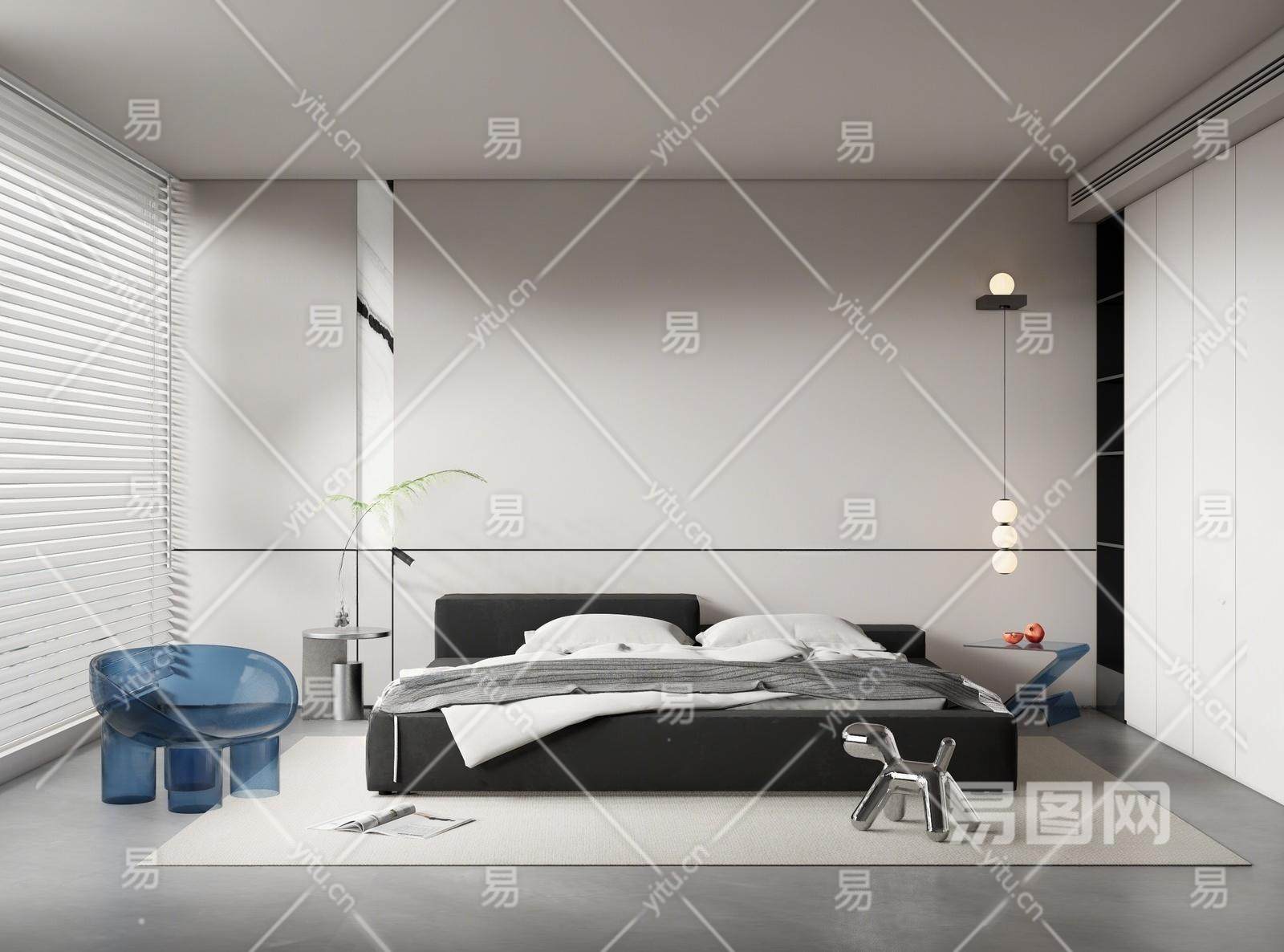 现代奶油风极简卧室 双人床 吊灯 休闲椅 壁灯