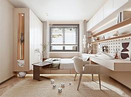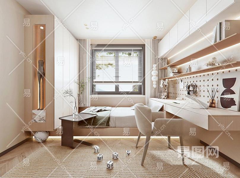 现代榻榻米卧室 布艺床 书桌 书架 衣柜 椅子