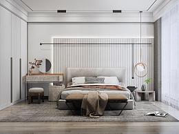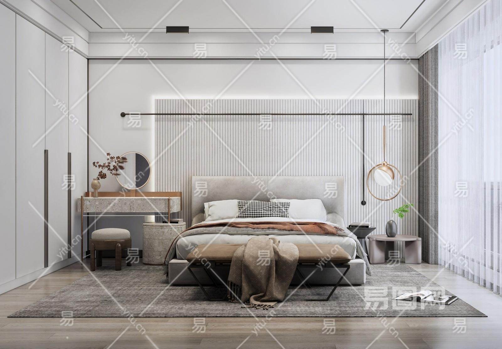 现代风格家居卧室 双人床 书桌 吊灯 床尾凳
