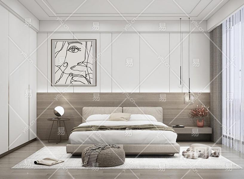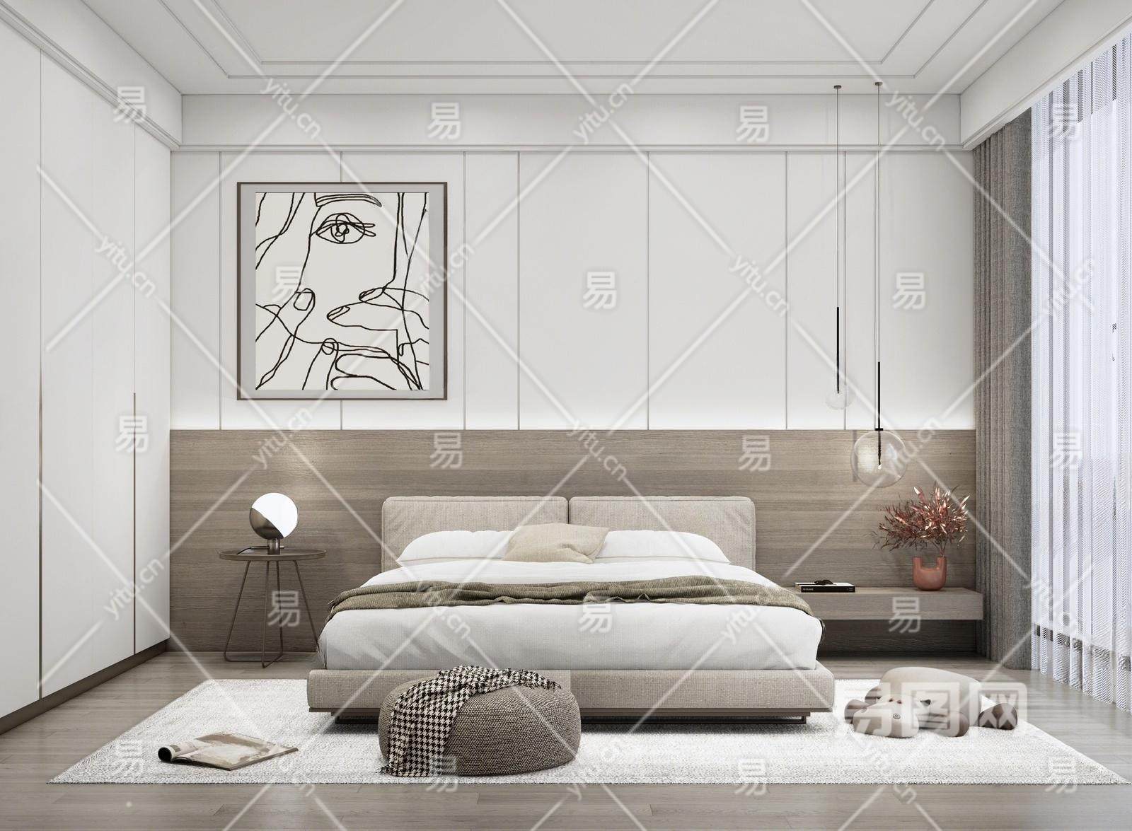 现代风格家居卧室 双人床 吊灯 台灯 雕塑 摆件 装饰画