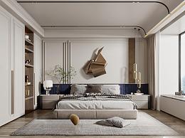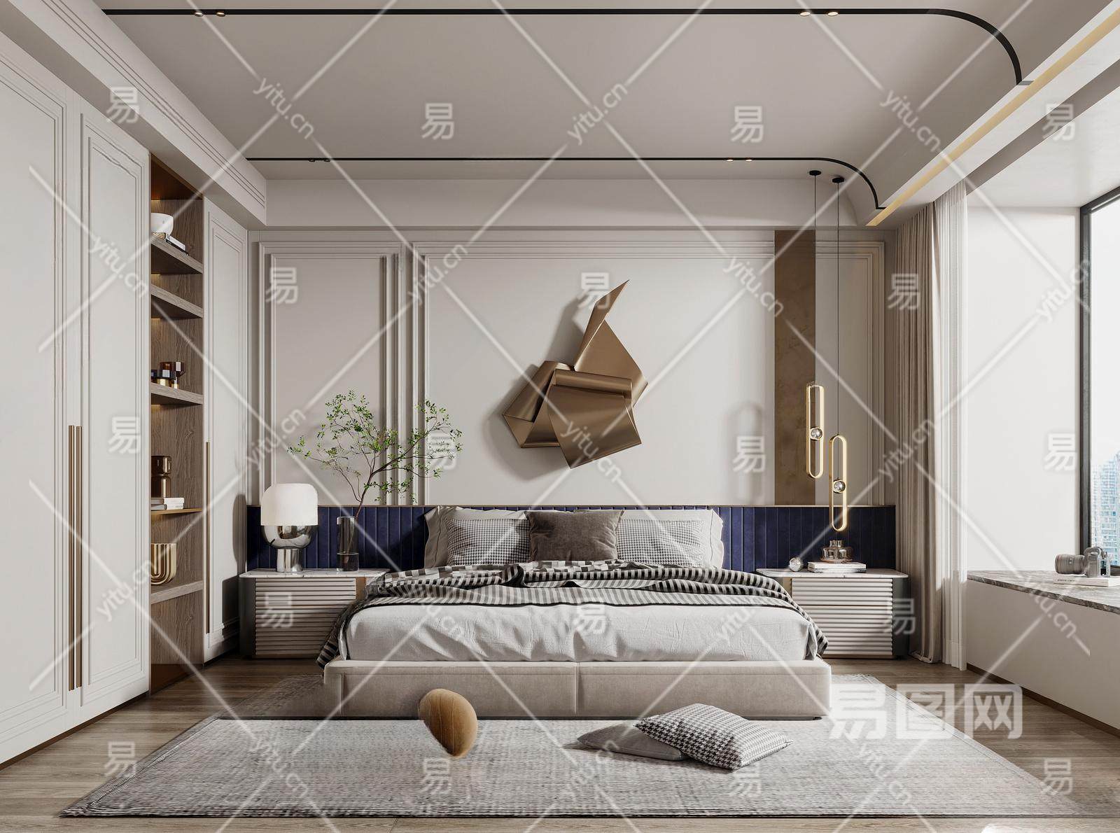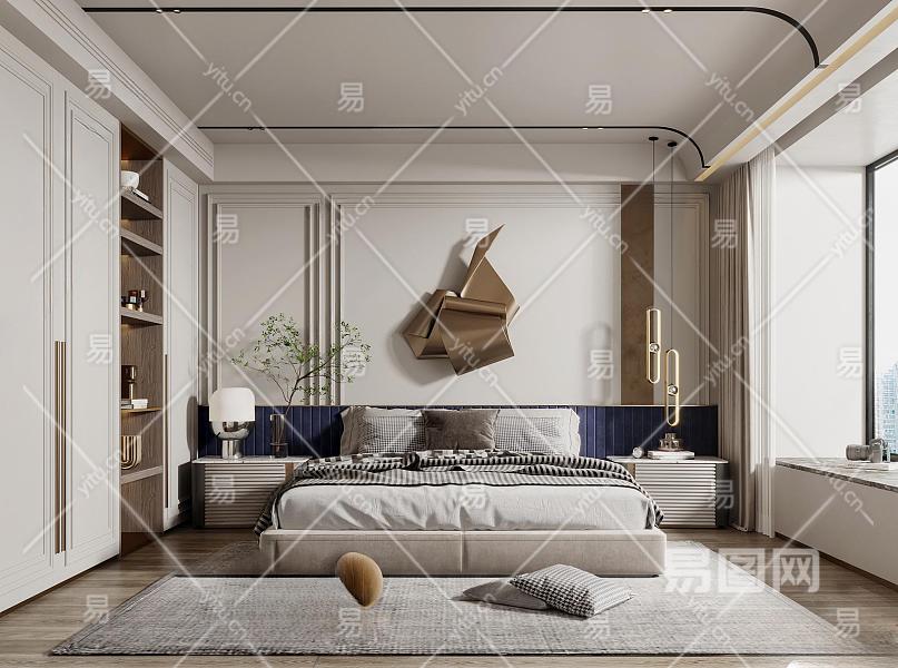 简欧家居卧室 双人布艺床 墙饰 床头柜 吊顶 衣柜