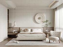 侘寂奶油风卧室 吊灯 墙饰 床 绿植 休闲椅