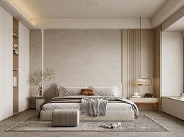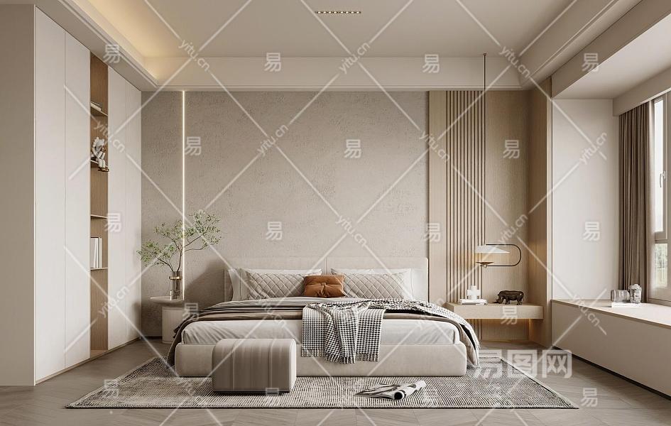 侘寂家居卧室 双人布艺床 边几 吊灯 植物 踏 地毯 靠包 衣柜