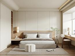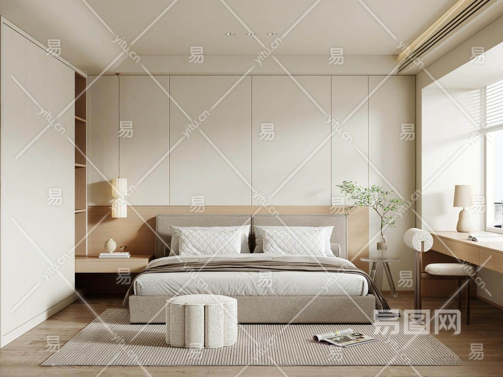 现代奶油风卧室 双人床 吊灯 单椅 书桌 衣柜 亚克力边几