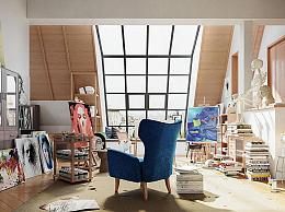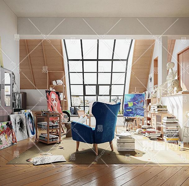 现代画室 书柜 书房 书籍书本 画架 颜料 美术室 雕塑摆件