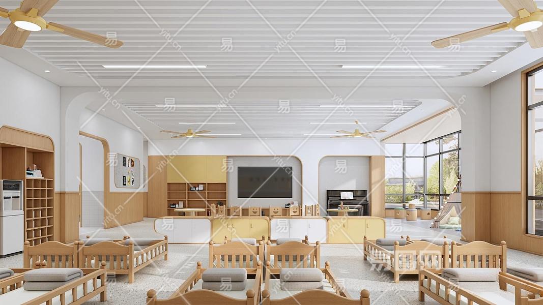 现代幼儿园午睡区 教学墙 饮水机 文化墙 儿童床 书包柜