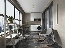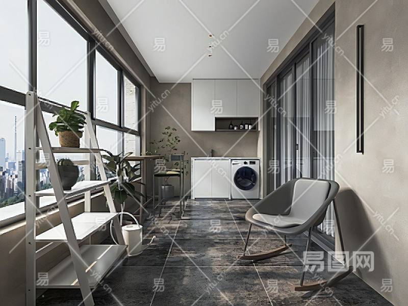现代家居阳台休闲阳台洗衣房洗手盆储物柜洗涤用品休闲摇椅SU模型