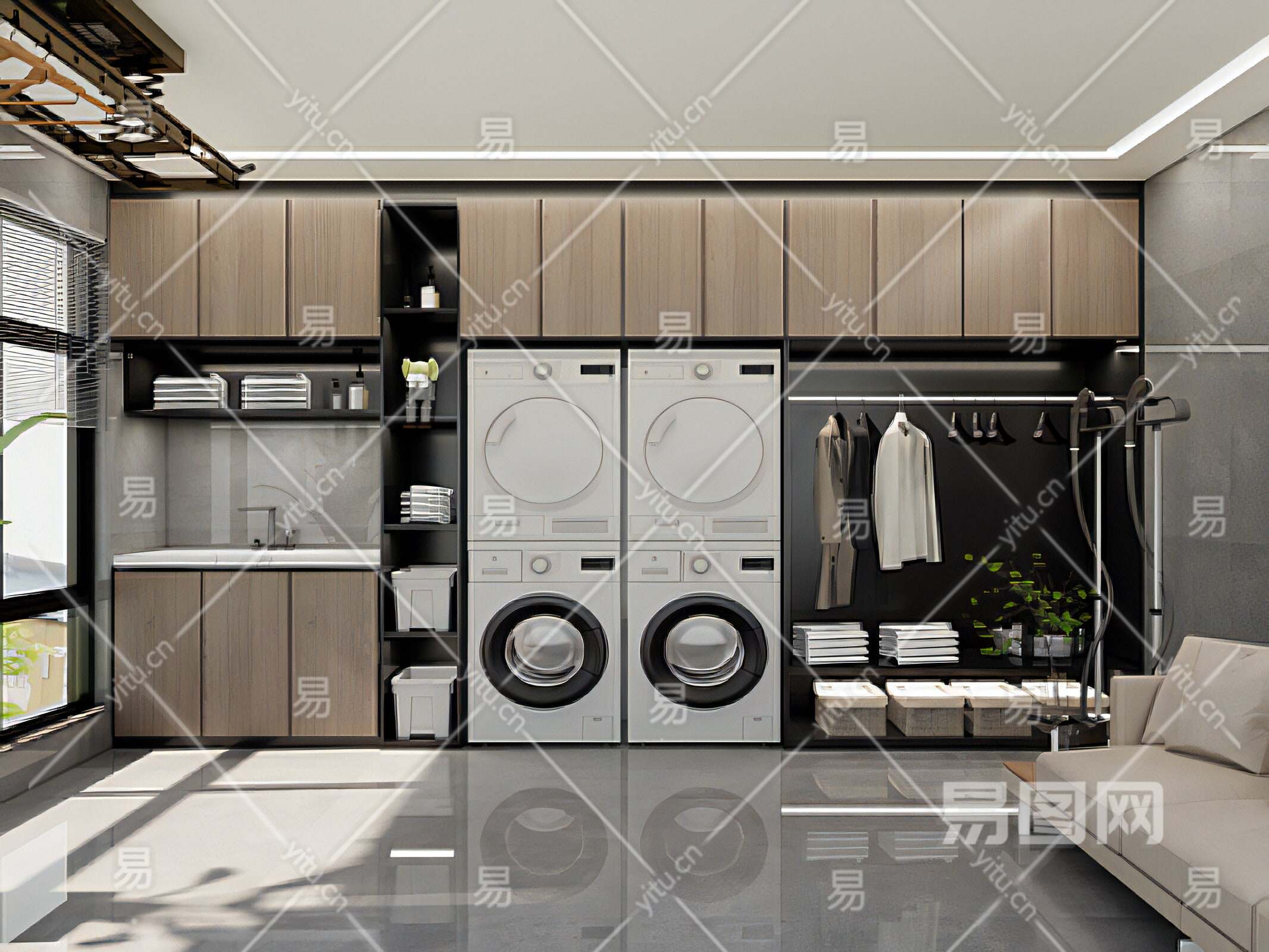 现代洗衣房洗烘一体机休闲沙发挂烫机衣柜百叶帘绿植SU模型