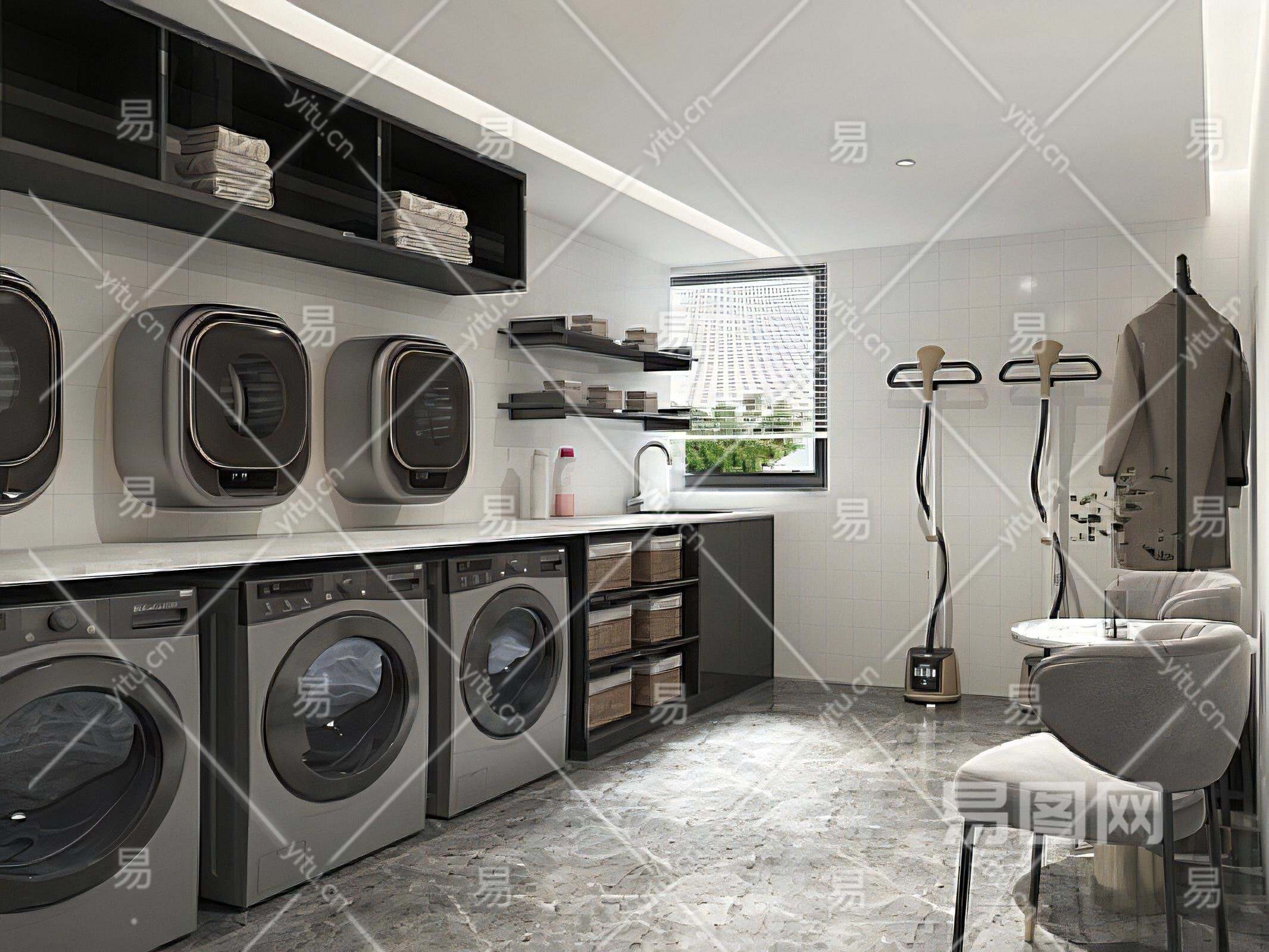 现代洗衣房洗衣机烘干机熨烫机挂烫机沙发茶几晾衣架花瓶SU模型
