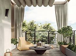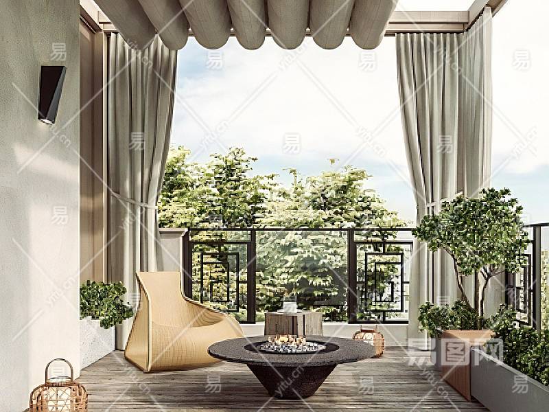 现代露台花园阳光房大阳台遮阳帘窗帘花池绿植火炉户外休闲椅SU模型