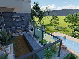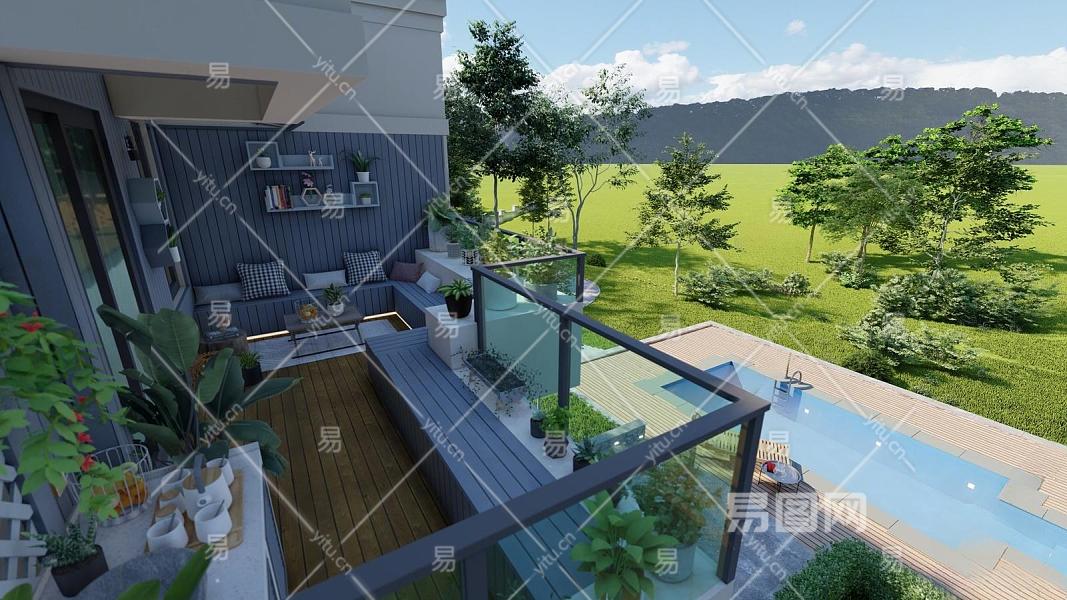 现代别墅阳台 景观阳台 休闲坐凳 户外操作台 户外座椅 绿植