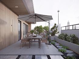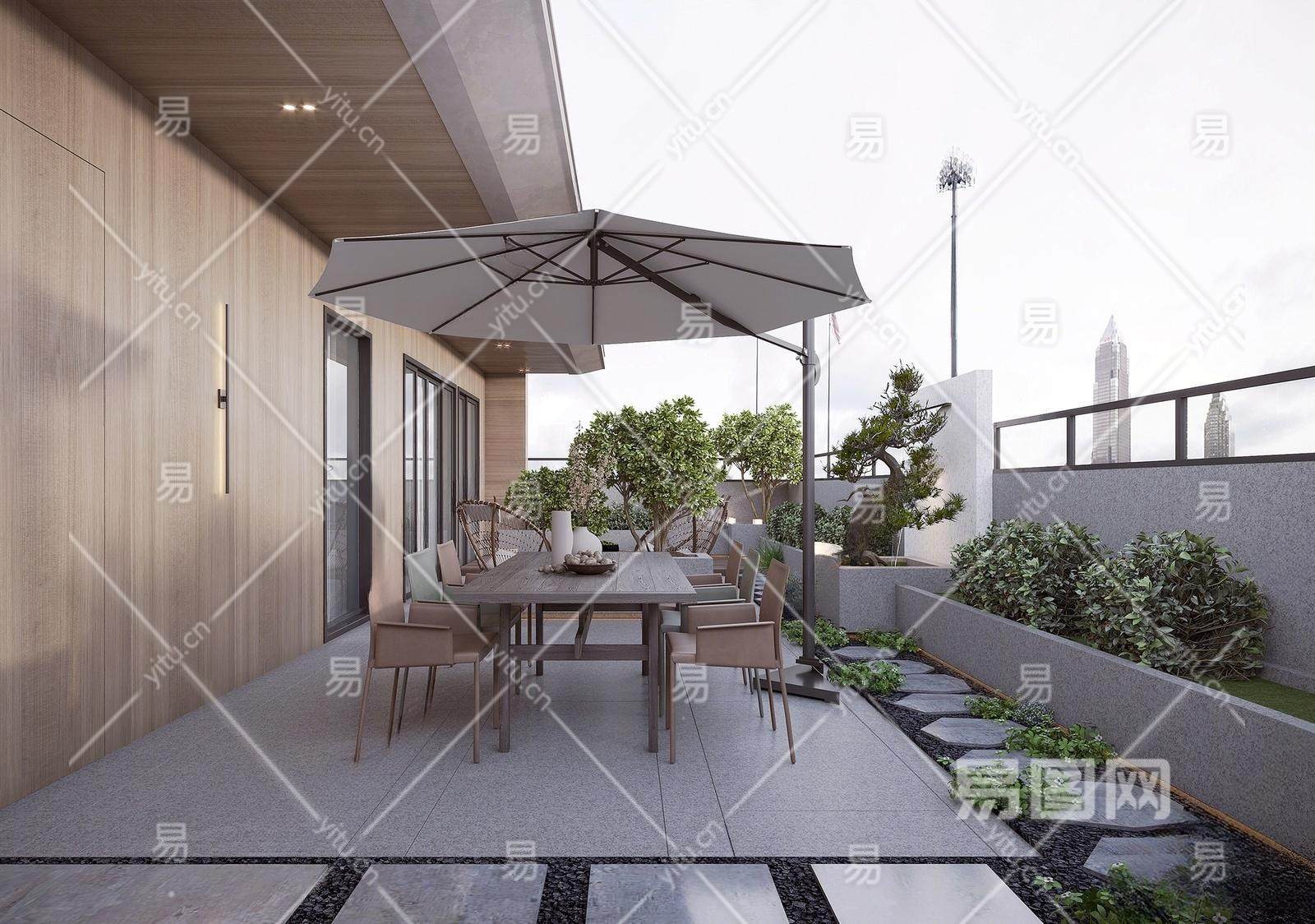 现代别墅阳台 露台 阳台 庭院 户外桌椅 遮阳伞 植物景观 绿植 庭院景观