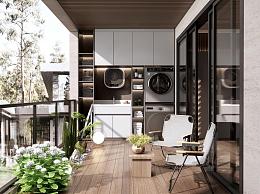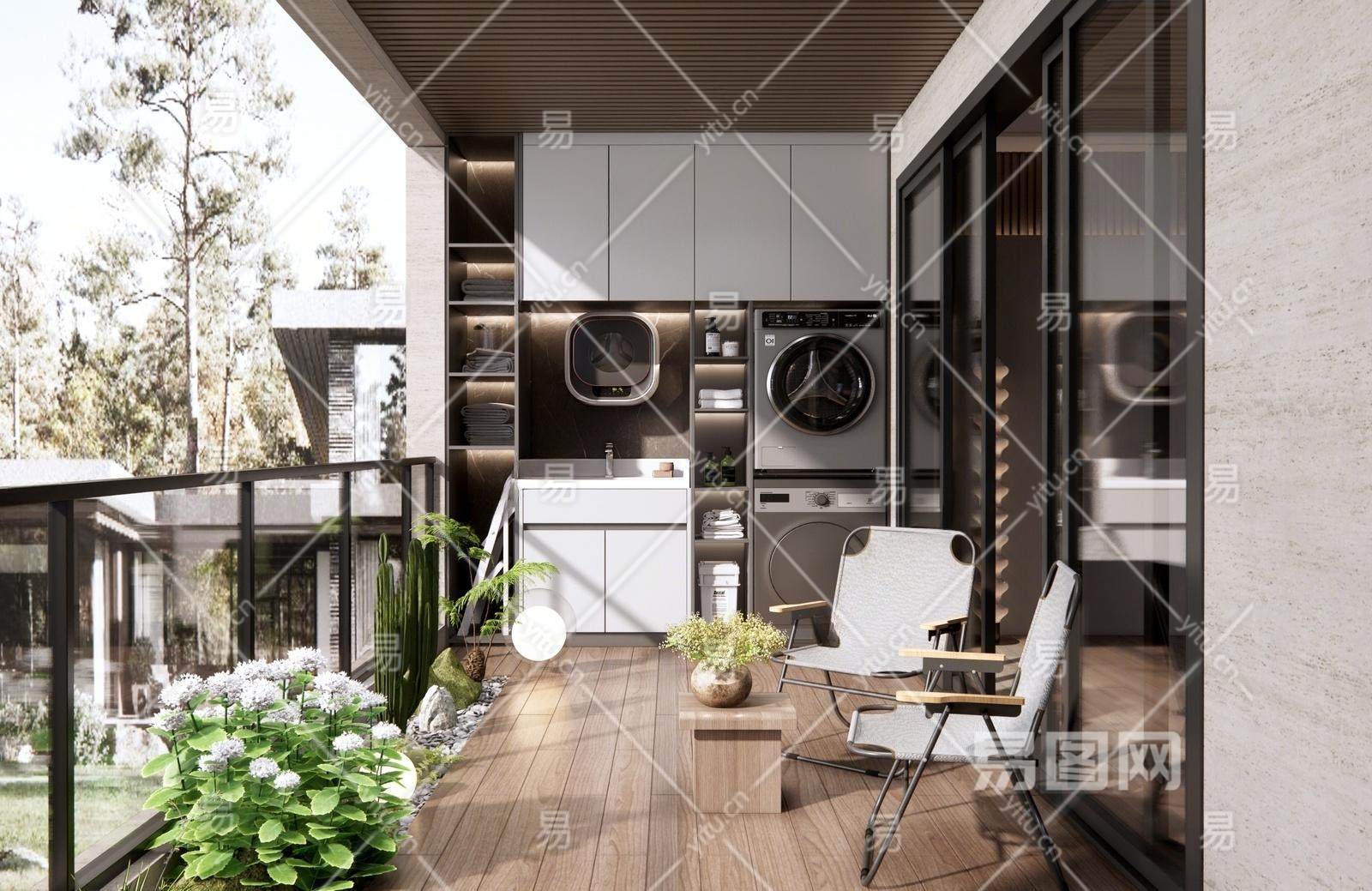 现代家居阳台 阳台柜 洗衣机 休闲椅 花草植物 蕨类植物