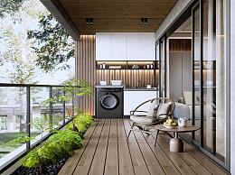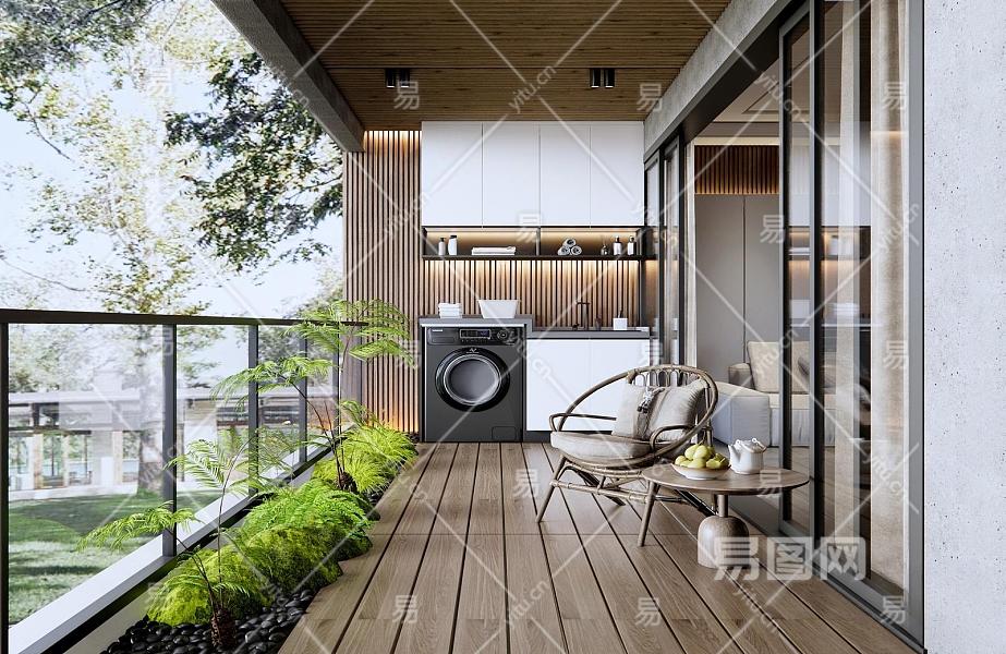 现代家居阳台 露台 洗衣机 阳台柜 推拉门 植物堆 藤编休闲椅 玻璃围栏