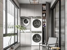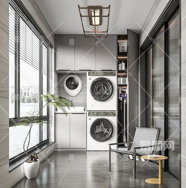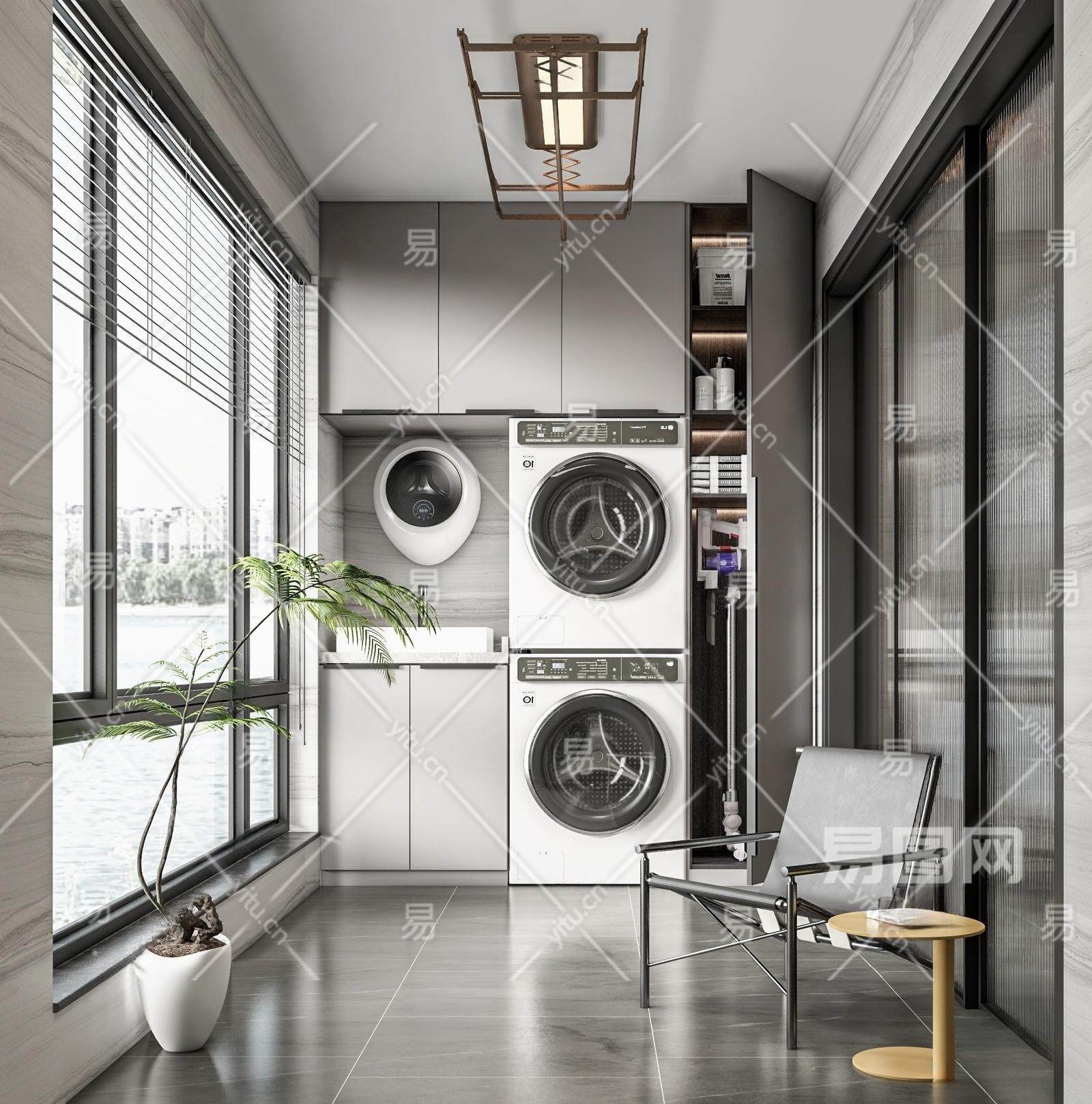 现代阳台 洗衣机柜 休闲椅 植物 推拉门