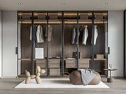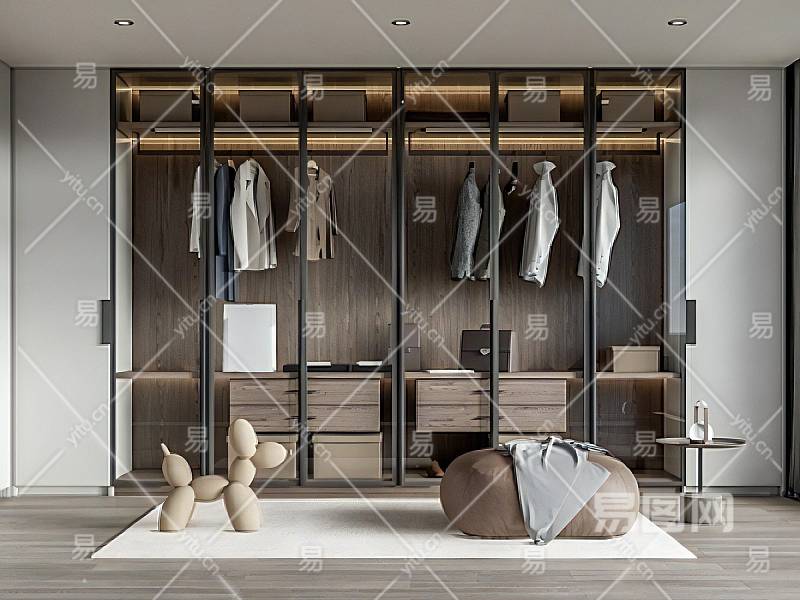 现代衣帽间玻璃门衣柜沙发凳角几组合地毯窗帘纱窗抽屉储物盒