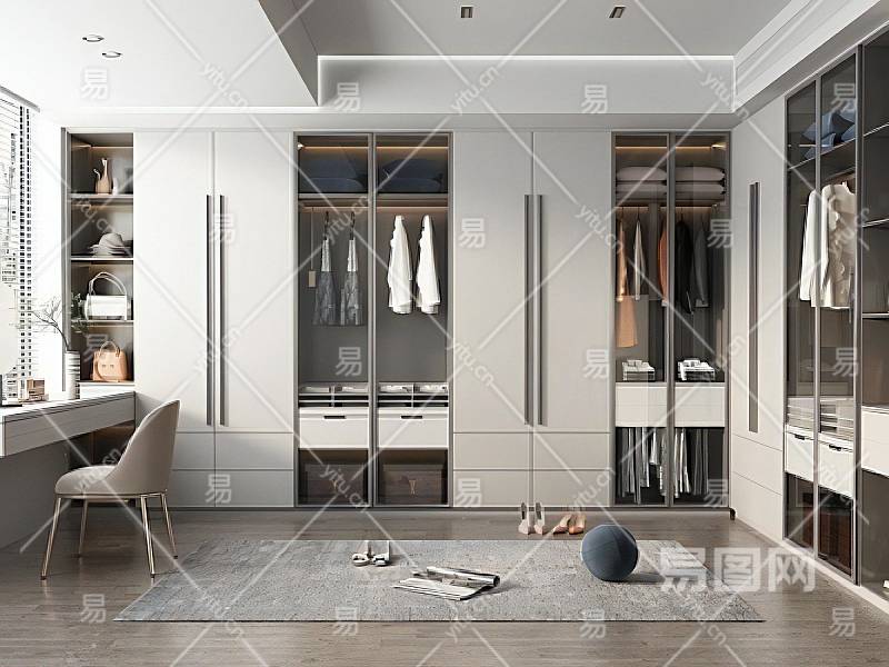 现代衣帽间试衣间化妆间梳妆台单椅衣柜服饰摆件地毯
